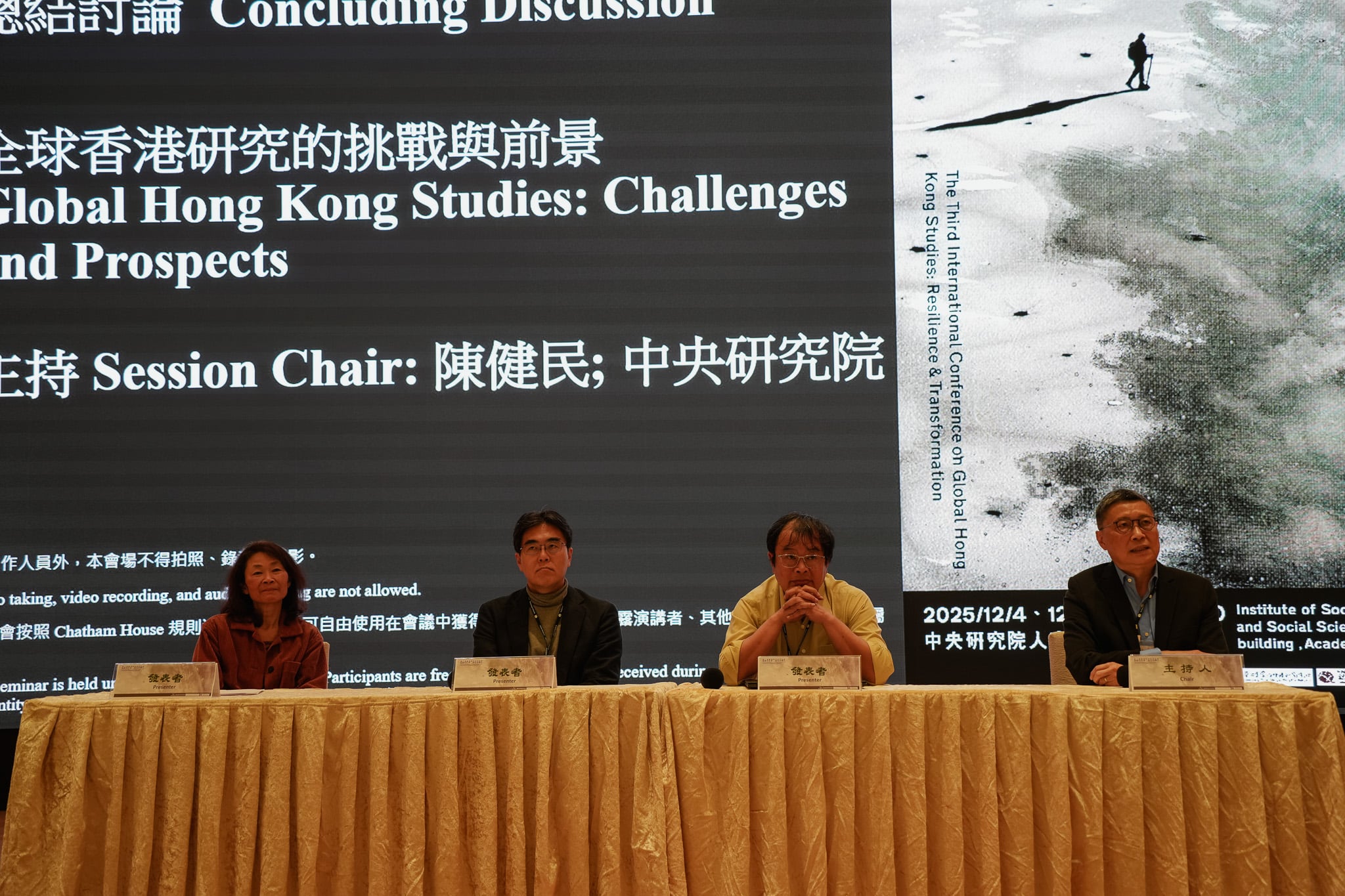 本屆香港研究國際研討會的總結討論,由臺灣香港研究學會理事長陳健民教授主持,邀請立教大學的倉田徹教授、加州大學洛杉磯分校的李靜君教授與國立臺灣大學何明修教授與談。作為本屆研討會總結討論,陳健民認為當我們一同「往前」回顧這場研討會時,同時也是在「往後」看香港研究與香港的未來,去思考香港研究面對的狀況,包含題目、方法上遭遇的限制,以及香港研究的本質是什麼的核心問題。